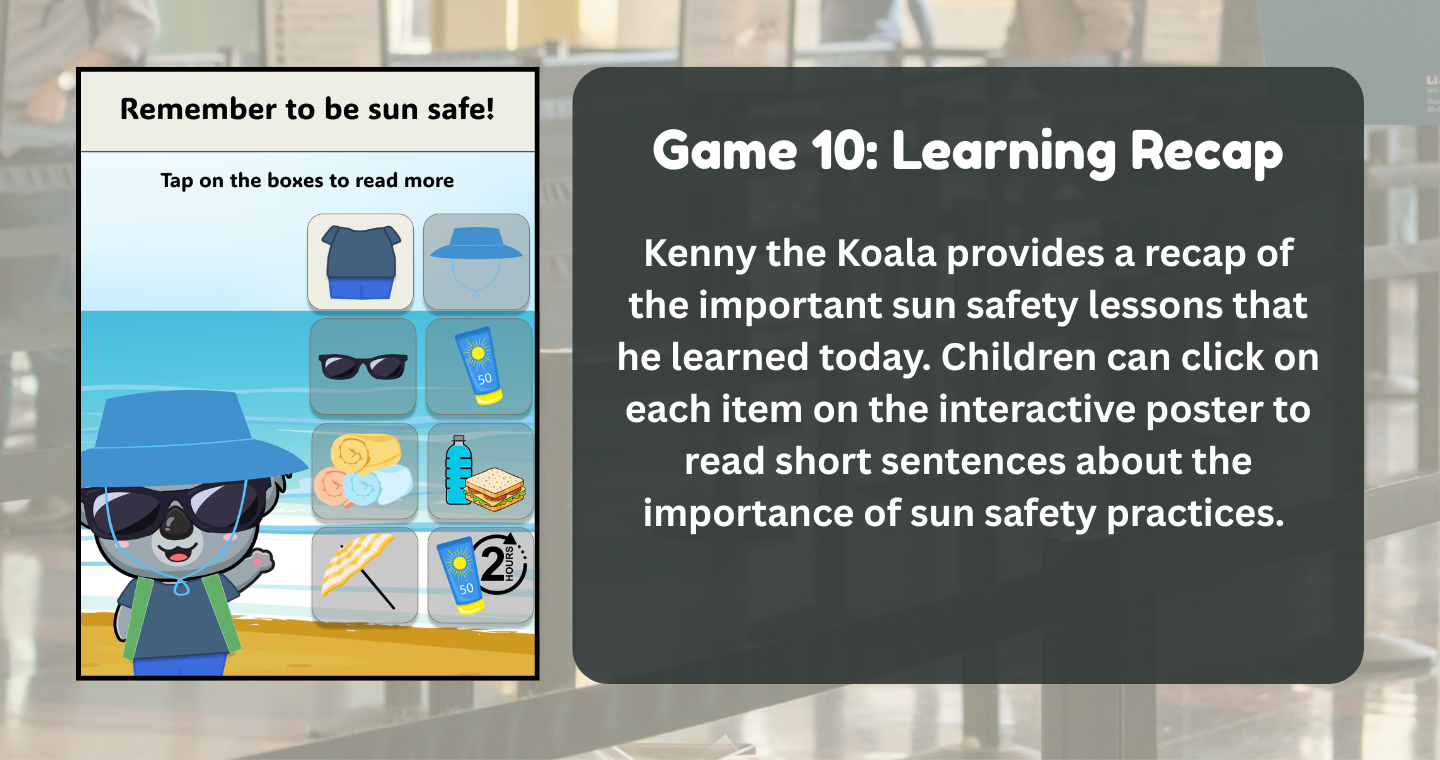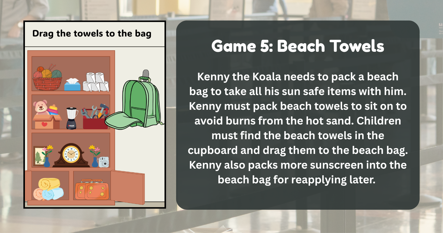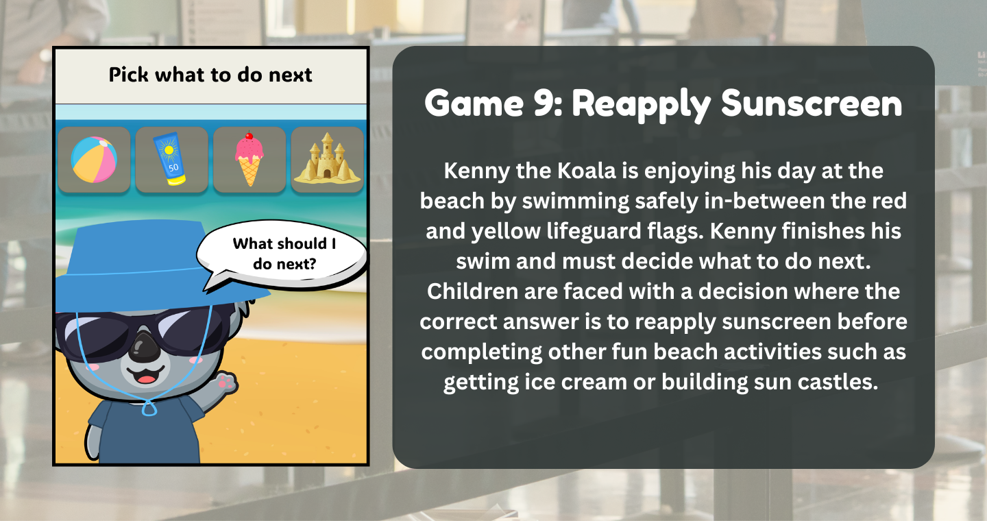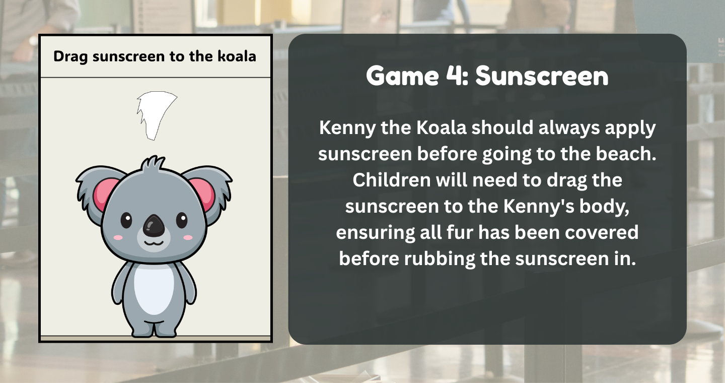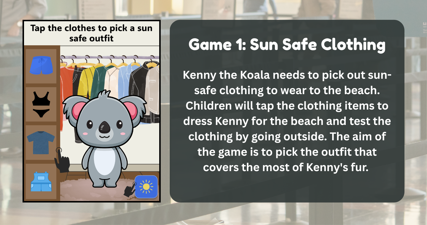 Brisbane Sunny Shores Campaign is a sun-safety educational story delivered to children aged 5-7 as an experience. The narrative is about Kenny the Australian Koala getting ready to go to the beach. In order to pack the right items, children must interact with 10 mini-games to help Kenny pack important sun-safe items such as hats, sunscreen, water and a beach umbrella. The story continues as Kenny arrives at the beach, ensuring the koala makes sun-safe decisions to avoid getting sunburn.