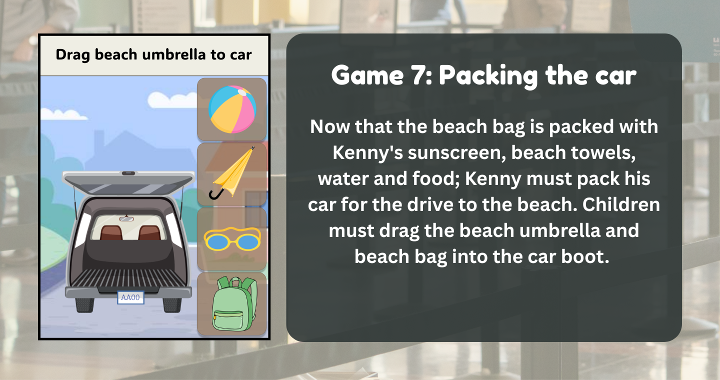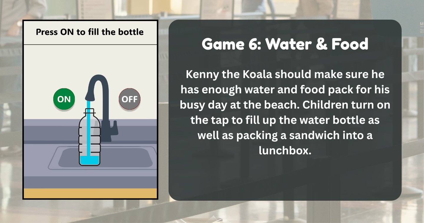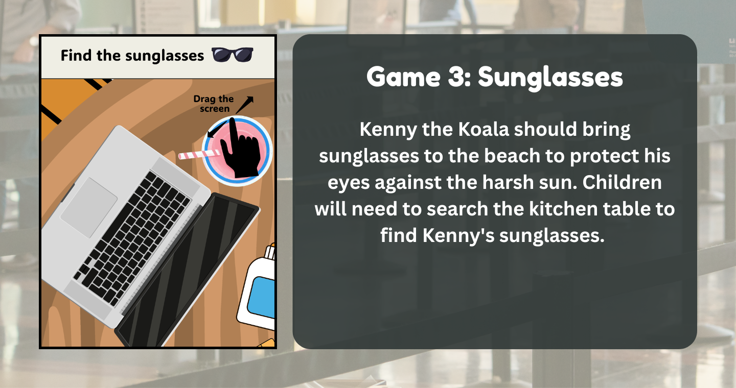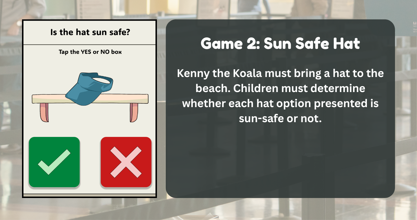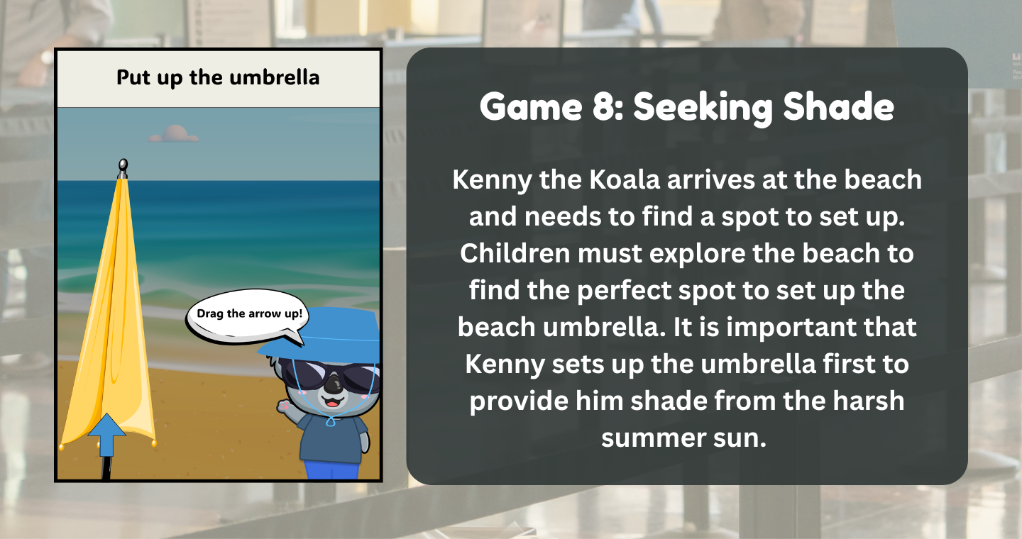 Brisbane Sunny Shores Campaign is a sun-safety educational story delivered to children aged 5-7 as an experience. The narrative is about Kenny the Australian Koala getting ready to go to the beach. In order to pack the right items, children must interact with 10 mini-games to help Kenny pack important sun-safe items such as hats, sunscreen, water and a beach umbrella. The story continues as Kenny arrives at the beach, ensuring the koala makes sun-safe decisions to avoid getting sunburn.