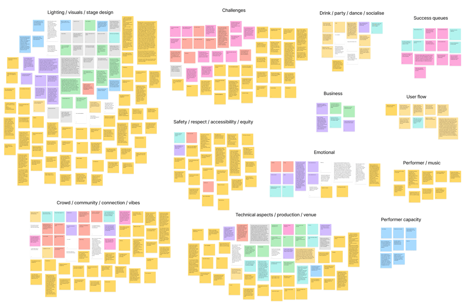Beneath the obvious objectives of having a great time and immersing themselves in the music, I discovered that both the performers and the audience were looking for “success queues” (smiling, dancing, body movement, attention) to increase their confidence and pleasure within the environment. A goal that surfaced that took me by surprise was that users were also concerned with accessibility, safety and community values being upheld.