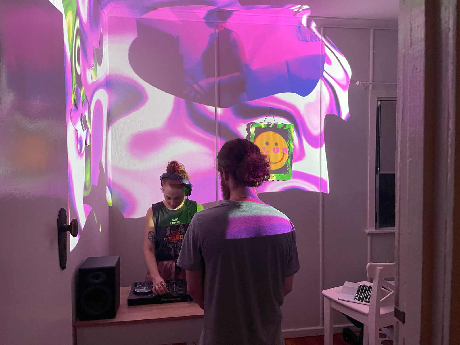 Several audience members had accessibility concerns such as vision sensitivity from strobing lights and being unable to see the DJ due to short stature, to accommodate this I ensured that the projections did not strobe or change in a volatile manner, and added a camera feed of the DJ at the top of the wall to increase visibility.