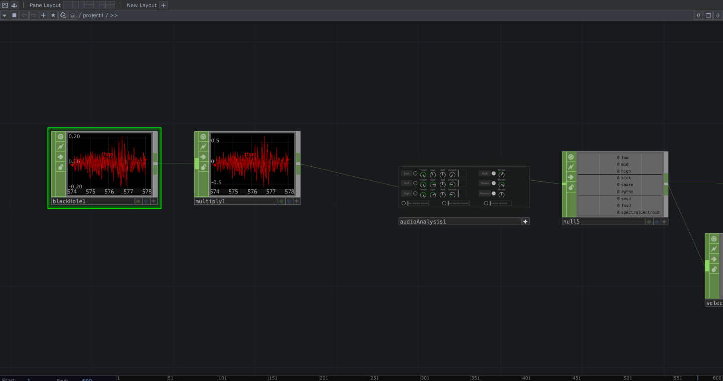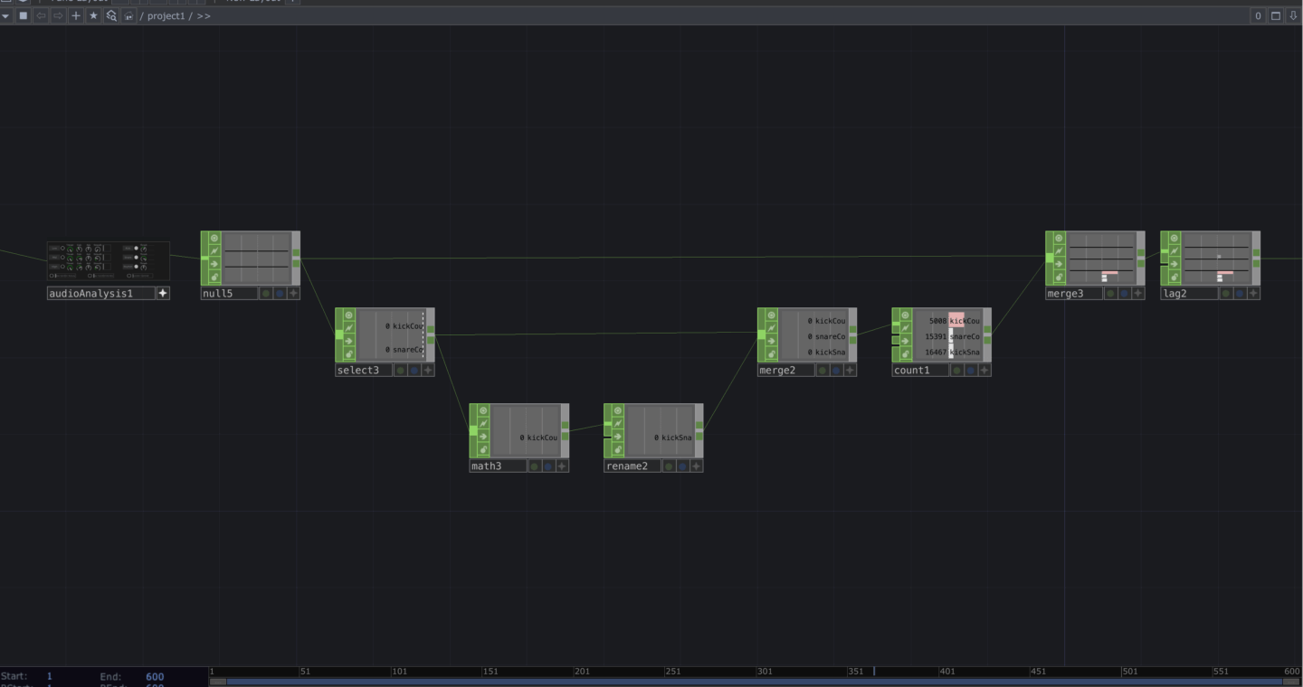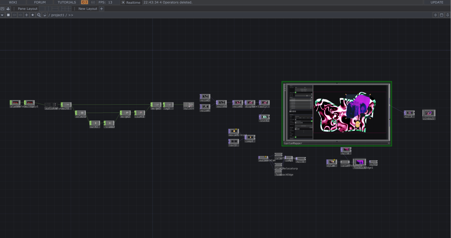 TouchDesigner is a node based, visual programming software. Within TouchDesigner the Flux system is a network that consists of two video inputs (one for the performer and one for the audience) and an audio input that receives music the DJ is playing. Unique visuals are computer generated and animated to be audio-reactive in addition to composites of videos and text all of which are then mapped and projected to surfaces behind a DJ in real time.