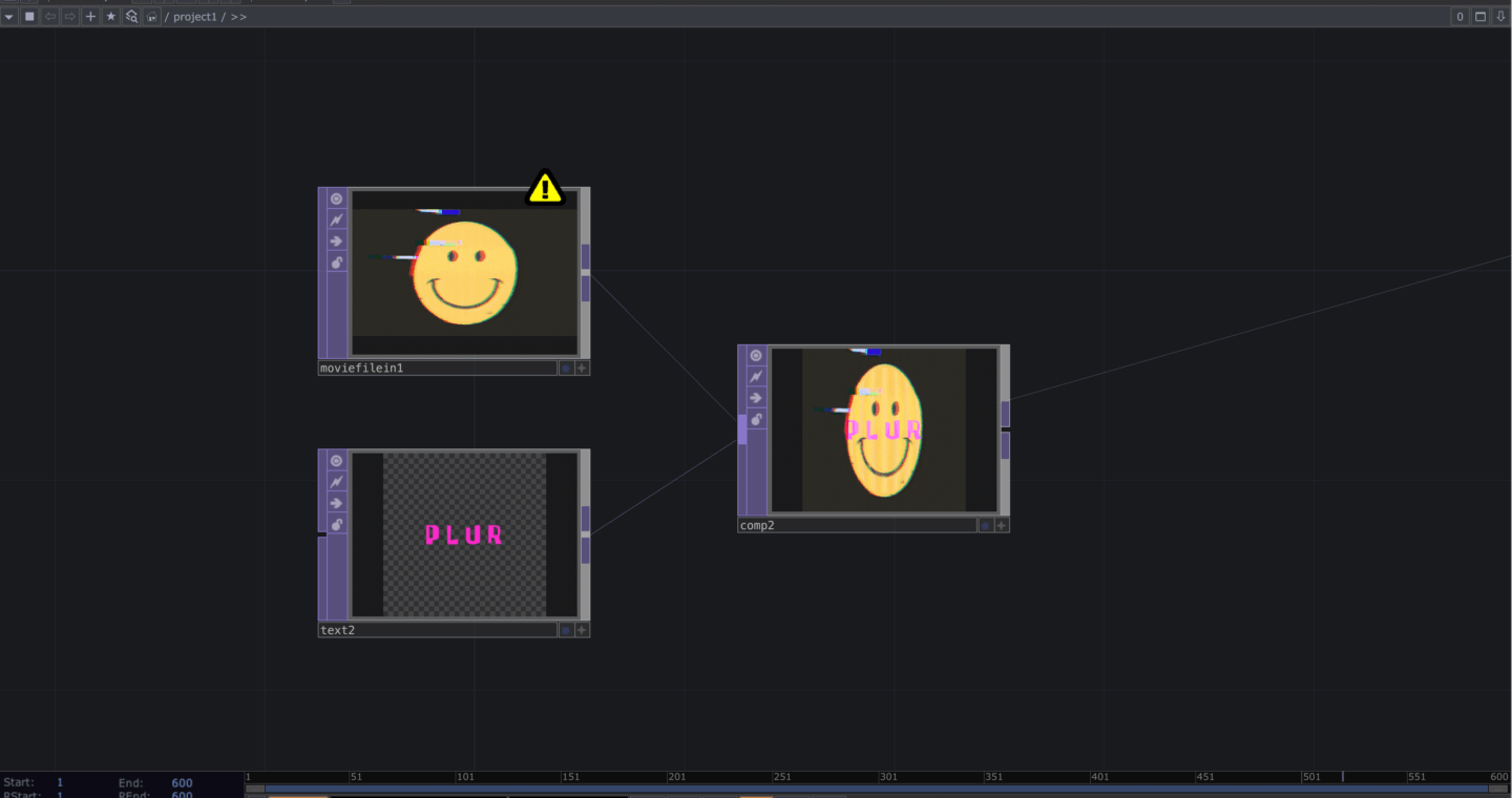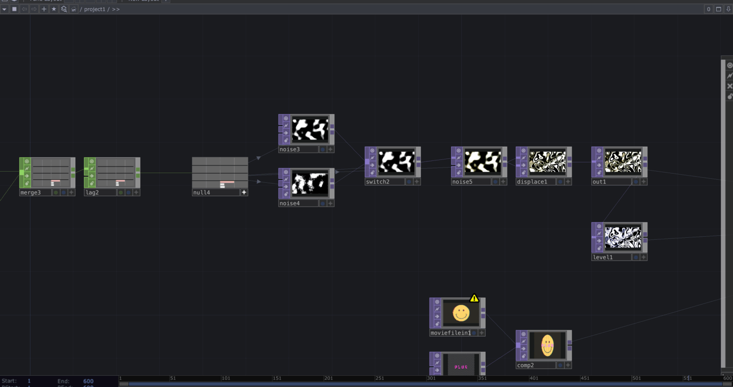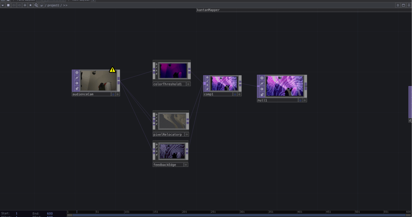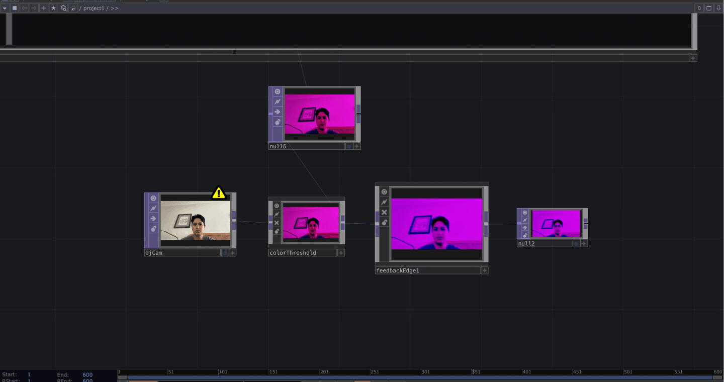 TouchDesigner is a node based, visual programming software. Within TouchDesigner the Flux system is a network that consists of two video inputs (one for the performer and one for the audience) and an audio input that receives music the DJ is playing. Unique visuals are computer generated and animated to be audio-reactive in addition to composites of videos and text all of which are then mapped and projected to surfaces behind a DJ in real time.