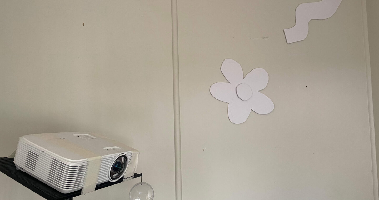 Through a series of nodes the audio is analysed, splitting it into high frequencies (snare), low frequencies (kick) and a combination of the two (rhythm) and these parameters are used as references to drive the visuals. The video inputs are processed to aesthetically match the visualisation, including a cloud of pixels for the audience camera that flows based on the audience’s movement. Kantan Mapper (TouchDesigner’s mapping feature) is used to “map” i.e. draw and layer shapes on the wall behind the DJ. The processed TOPS (texture operators) of these networks are then assigned to the shapes and the entire scene is sent to a projector. To increase the visual interest of the projections white projection surfaces including flowers, abstract shapes and a picture frame were constructed and fixed behind the DJ to be mapped onto.