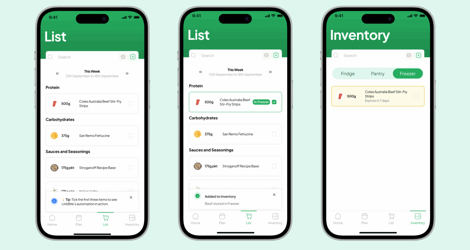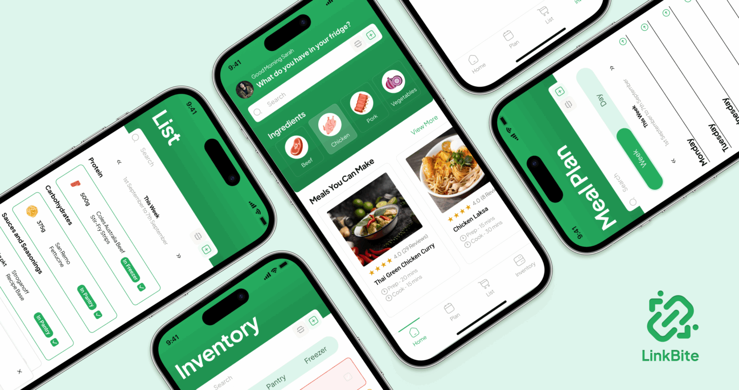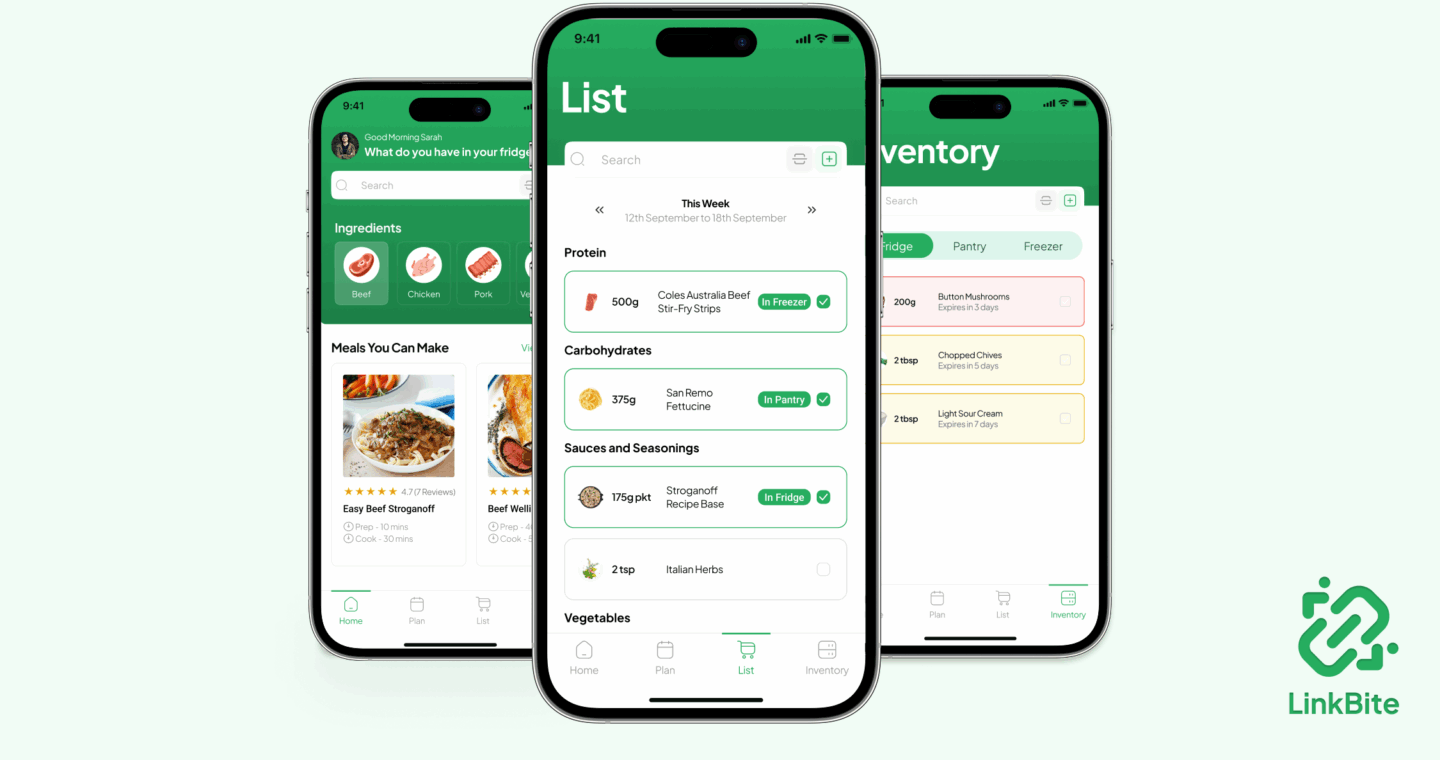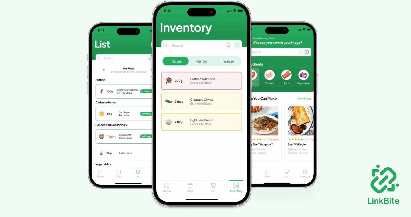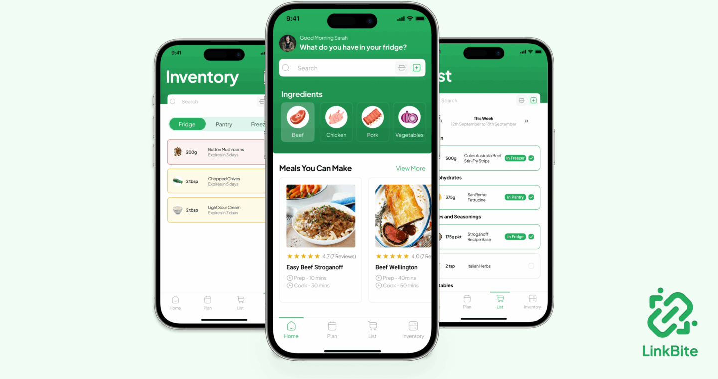 LinkBite addresses this by automating key parts of the meal-planning process. The app connects recipes, grocery lists, and inventory management in a seamless flow, allowing users to see what they already have, plan around it, and reduce waste effortlessly. Through smart feedback, clear visual cues, and simplified navigation, LinkBite turns meal planning into an intuitive, low-friction experience that supports sustainable everyday cooking habits.