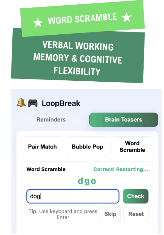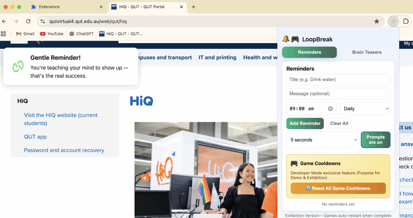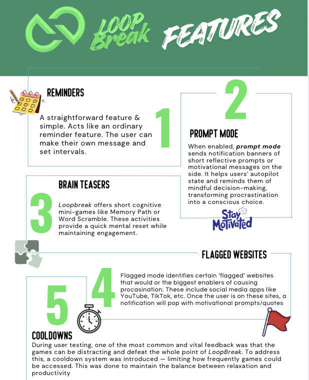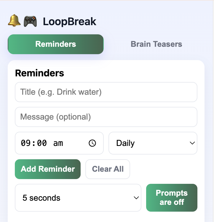 LoopBreak is an interactive browser extension that helps users reduce procrastination and build healthier online habits. Instead of blocking websites, it uses positive reinforcement through motivational prompts/quotes, set your own reminders, and 'brain teasers' mini games that act as cognitive resets to gently guide users back to focus.