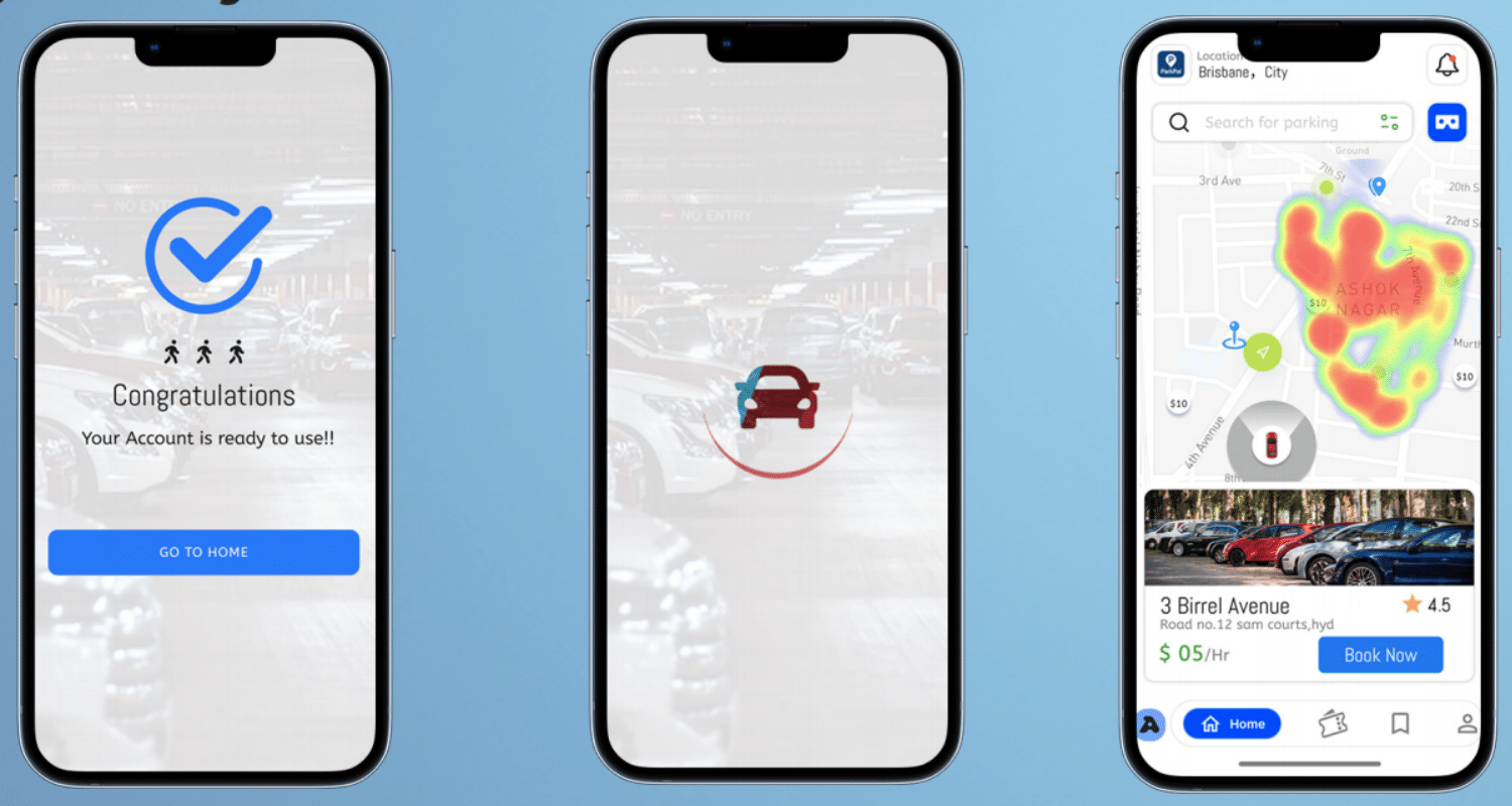 The final screen introduces the Home Page, where users can explore real-time parking availability through an interactive heatmap visualization. The color-coded display helps users quickly identify available parking zones nearby. Additional features, such as hourly pricing, rating, and AR navigation, enhance decision-making and efficiency. Together, these screens ensure a consistent and user-friendly transition from setup to daily use — embodying ParkPal’s mission of making parking simpler, faster, and more intuitive.