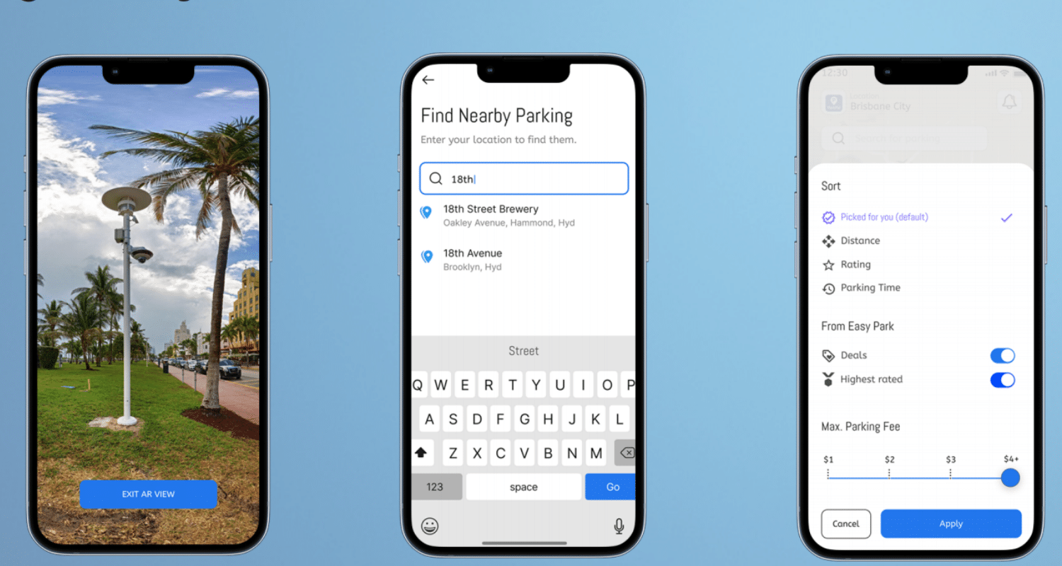 The Search interface simplifies exploration by allowing users to type or voice input a location, instantly displaying relevant parking results with map-based context. Complementing this, the Filter panel enables users to sort parking options by distance, rating, or duration, and to toggle features like deals or pricing caps.