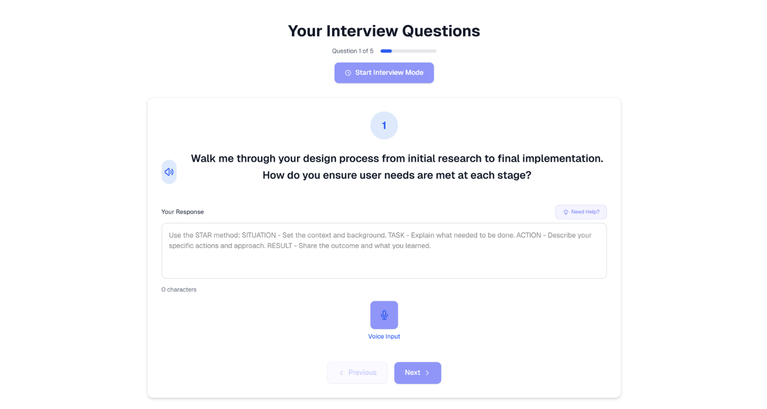 – Real-Time Feedback: Analysis of tone, clarity, and confidence in user responses.