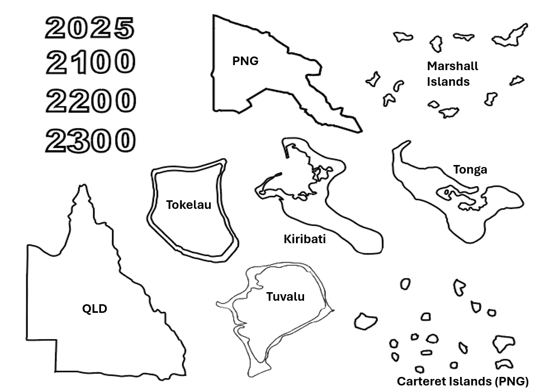 The project was constructed using elevated laser cut continents that were mapped against Scientific predictions and rising sea level map simulators. Although countries such as Australia and Papua New Guinea will be greatly impacted, specifically around the coastal areas, I wanted to show the comparison between a lot of the smaller countries that will be drastically impacted and even some of them gone by the year 2300. Studies reveal that Pacific Island Nations are only responsible for 0.03% of global emissions, with countries such as Tokelau being the first in the world to run entirely on renewable solar energy, but are facing significant damage and tragedy. This not only includes forced migration and economic collapse but thousands of years of family land and cultural heritage that is disappearing as every year passes. I am hoping the project will share the names and cultures of these countries and prompt discussions on making more environmentally sustainable choices to minimise carbon emissions and the impacts of global warming.