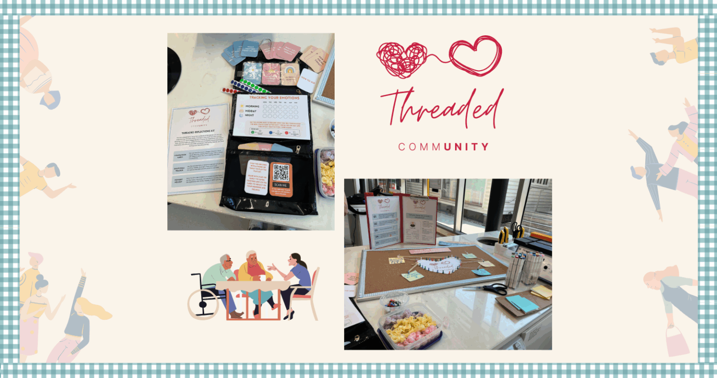 Threaded Community supports elderly long-term spinal unit patients in recovery limbo through a bedside Reflective Kit and a communal Collaborative Board. Using co-design, the project encourages gentle emotional expression and creativity, transforming the hospital environment into a space where patients can reflect, share their stories, and feel supported through meaningful connection.