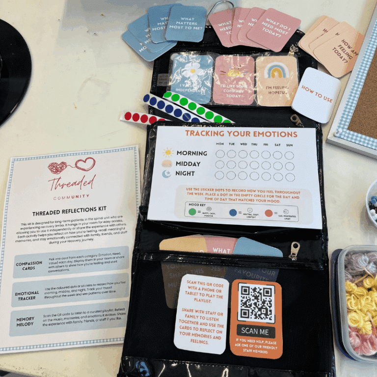Threaded Community supports elderly long-term spinal unit patients in recovery limbo through a bedside Reflective Kit and a communal Collaborative Board. Using co-design, the project encourages gentle emotional expression and creativity, transforming the hospital environment into a space where patients can reflect, share their stories, and feel supported through meaningful connection.