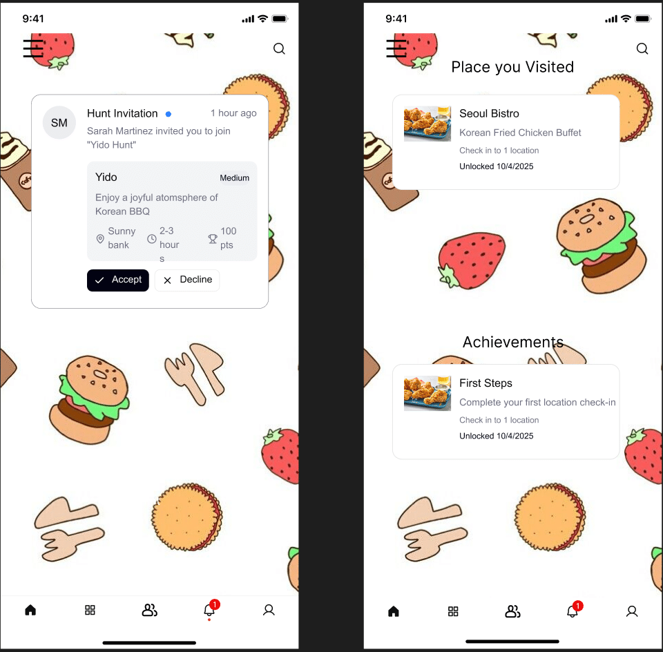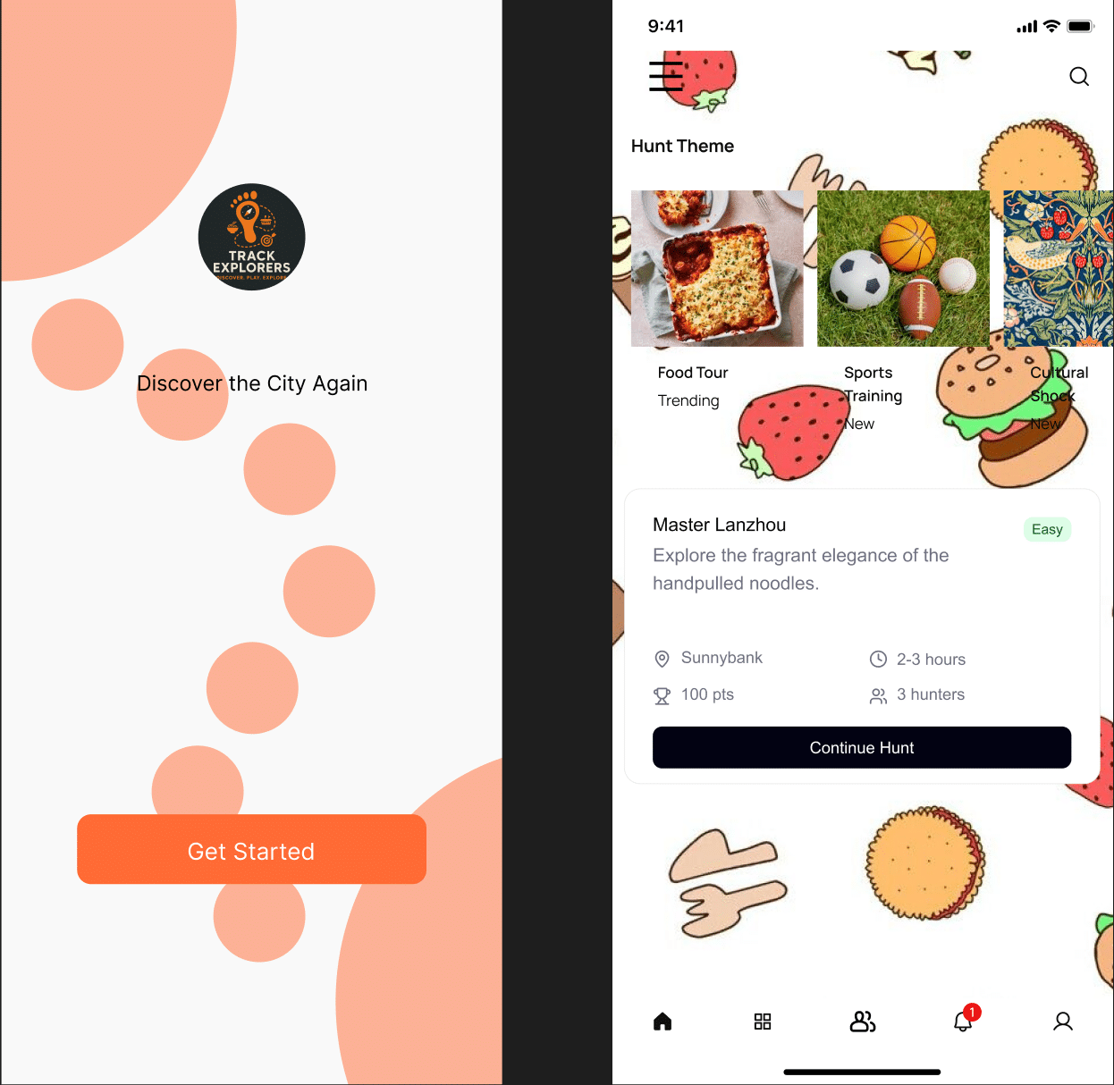 Track Explorers is an interactive city-exploration app designed in Figma to help locals and newcomers discover hidden gems in their area. Through themed experiences, food, sports, and entertainment, it encourages users to explore, swipe, and interact with personalized maps, transforming ordinary surroundings into engaging adventures through intuitive design and playful discovery.